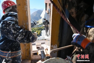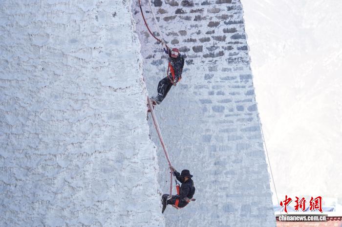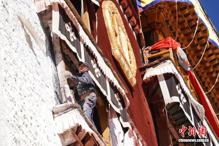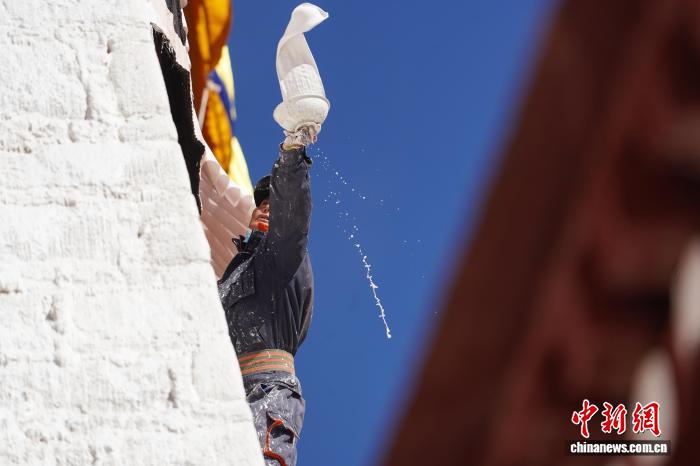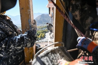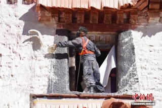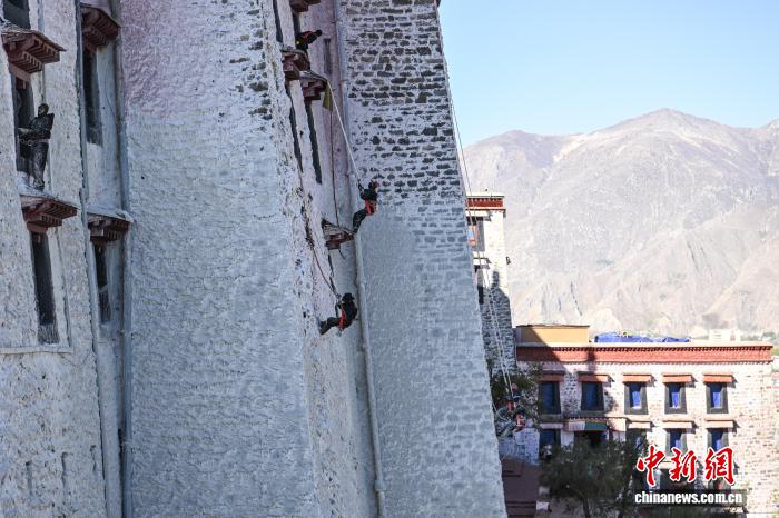 圖為工作人員對布達拉宮外墻噴灑涂料。中新社記者 貢嘎來松 攝