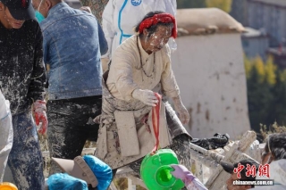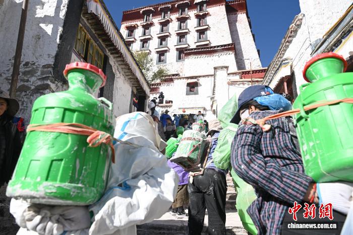 圖為拉薩信眾排隊搬運布達拉宮粉刷使用的涂料。中新社記者 貢嘎來松 攝