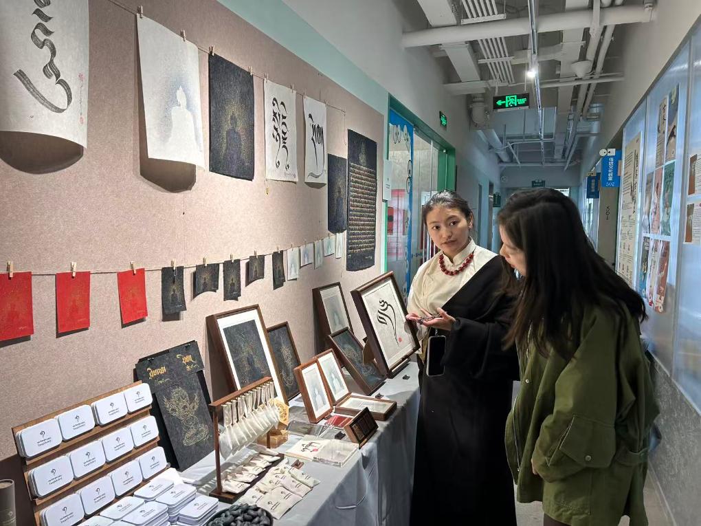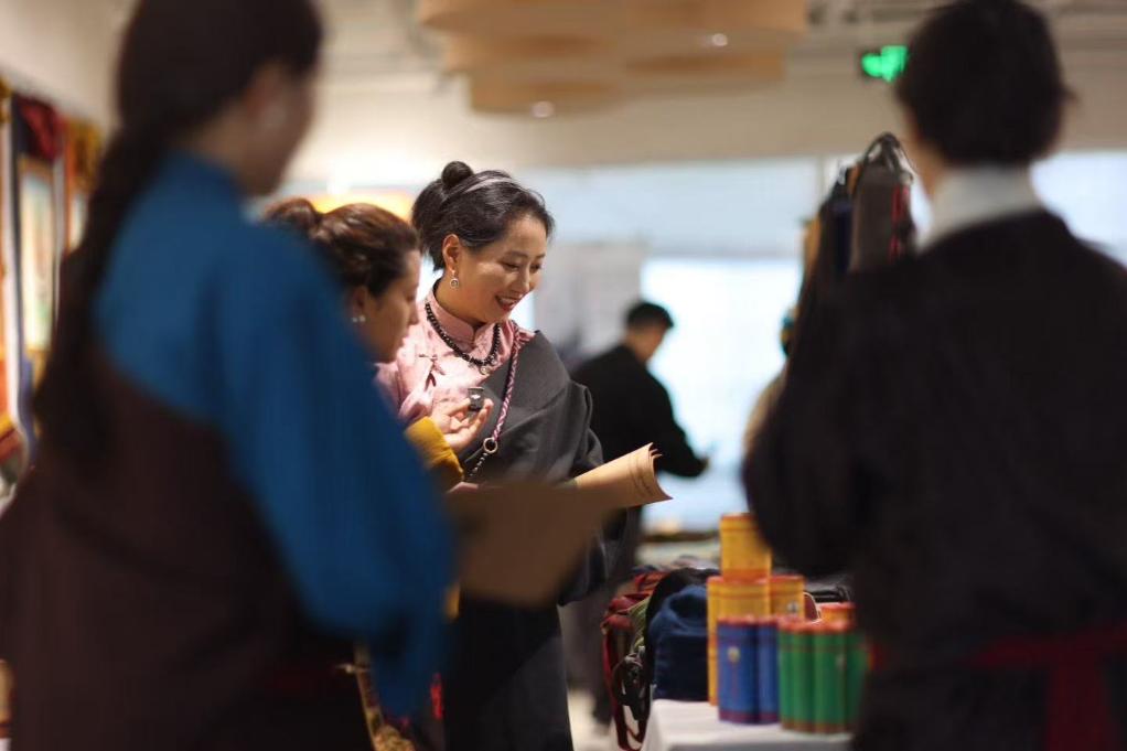 在“麥宿手藝人&守藝人”成都巡展活動(dòng)現(xiàn)場,達(dá)瓦卓瑪(左三)為參觀者介紹展品(10月24日攝)。新華社發(fā)