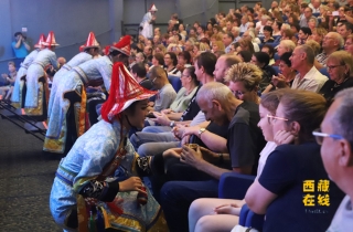 海法觀眾們沉浸其中,積極與演員互動(dòng),現(xiàn)場(chǎng)氣氛十分熱烈。當(dāng)小提琴和琵琶演奏起以色列名曲《多娜多娜》時(shí),觀眾的臉上流露出驚喜的神色,跟著旋律一齊吟唱律動(dòng)起來(lái)。當(dāng)表演《裕固族婚禮》的演員走下舞臺(tái),為觀眾們端上來(lái)自甘肅的特色美酒時(shí),現(xiàn)場(chǎng)互動(dòng)達(dá)到高潮。