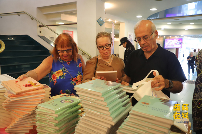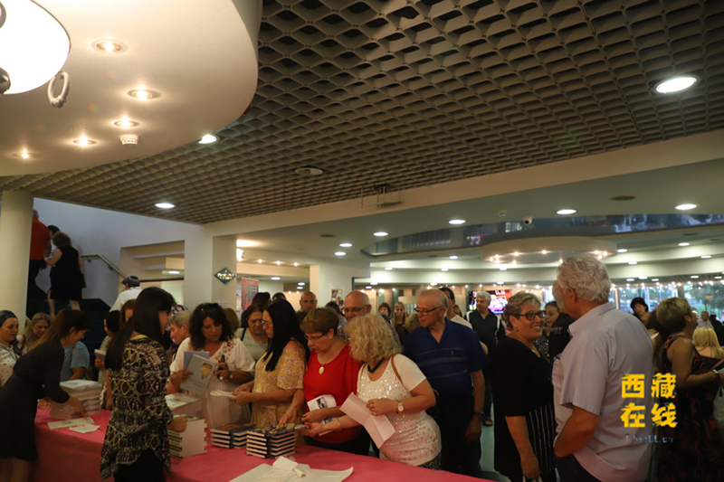記者在現(xiàn)場(chǎng)看到,離演出開(kāi)演還有一段時(shí)間,觀眾們就早早地在劇場(chǎng)門(mén)口排起了長(zhǎng)長(zhǎng)的隊(duì)伍,等待檢票進(jìn)場(chǎng)。而劇場(chǎng)入口處圖書(shū)展中展出的中國(guó)圖書(shū)也早已被觀眾們?nèi)¢喴豢?,?lái)晚的觀眾都為沒(méi)能領(lǐng)到中國(guó)文化書(shū)籍而感到遺憾。