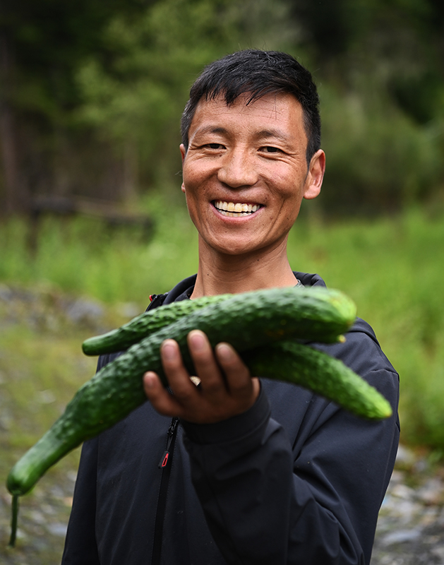 西藏山南市隆子縣玉麥鄉(xiāng)村民展示大棚里采摘的黃瓜,這些黃瓜將通過合作社銷往各地(2020年7月30日攝)。新華社記者 普布扎西 攝