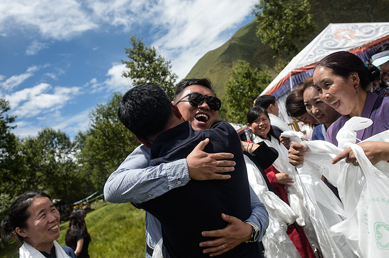 在西藏拉薩市達(dá)孜區(qū),北京大學(xué)腫瘤醫(yī)院的援藏醫(yī)生袁燦(帶墨鏡者)與送別的藏族同事?lián)肀В?020年8月1日攝)。新華社記者 彭子洋 攝