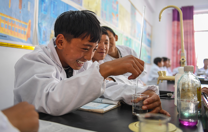 西藏昌都市芒康縣鹽井中學(xué)學(xué)生在上化學(xué)課(2019年6月6日攝)。新華社記者 晉美多吉 攝