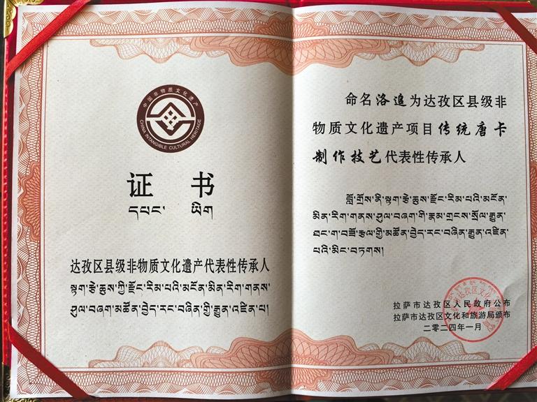 十多年來(lái)始終不懈地致力于唐卡藝術(shù)的傳承工作,讓洛追獲得了不少獎(jiǎng)項(xiàng)。2012年《大威德金剛》榮獲2012年全國(guó)民族地區(qū)職業(yè)院校教學(xué)成果展演活動(dòng)學(xué)生作品展覽金獎(jiǎng),2014年獲得高級(jí)技能證,2016年參加“指尖神韻”藏族唐卡大師丹巴繞旦師徒作品展,2017年獲得第七屆西藏唐卡藝術(shù)博覽會(huì)“優(yōu)秀唐卡畫(huà)師”榮譽(yù)稱號(hào),2019年獲得創(chuàng)新創(chuàng)業(yè)技能競(jìng)賽唐卡繪畫(huà)金獎(jiǎng),2018年獲得達(dá)孜區(qū)第三屆青年創(chuàng)新創(chuàng)作大賽一等獎(jiǎng),2023年洛追成為達(dá)孜區(qū)縣級(jí)非物質(zhì)文化遺產(chǎn)項(xiàng)目傳統(tǒng)唐卡制作技藝代表性傳承人。