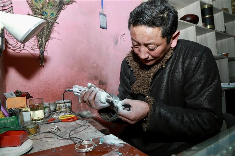此時(shí),一位顧客走進(jìn)店內(nèi):“你好,我現(xiàn)在定做阿吉祖玉首飾大概什么時(shí)候能完成呀?”顧客滿懷期待地問道。“現(xiàn)在訂單比較多,不過您放心,在藏歷新年前肯定能完成。”次央多吉熱情地回應(yīng)道。