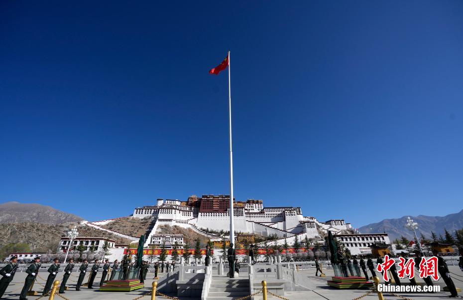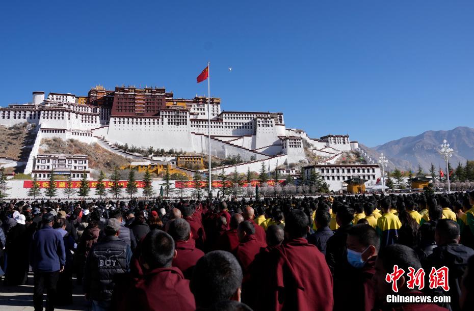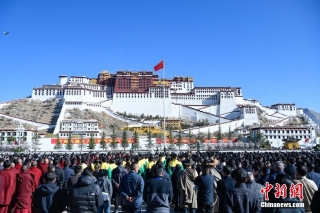 3月28日,西藏各族各界人士聚集在拉薩布達(dá)拉宮廣場(chǎng),升國(guó)旗、唱國(guó)歌,參加西藏百萬(wàn)農(nóng)奴解放66周年紀(jì)念活動(dòng)。