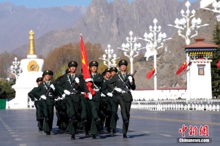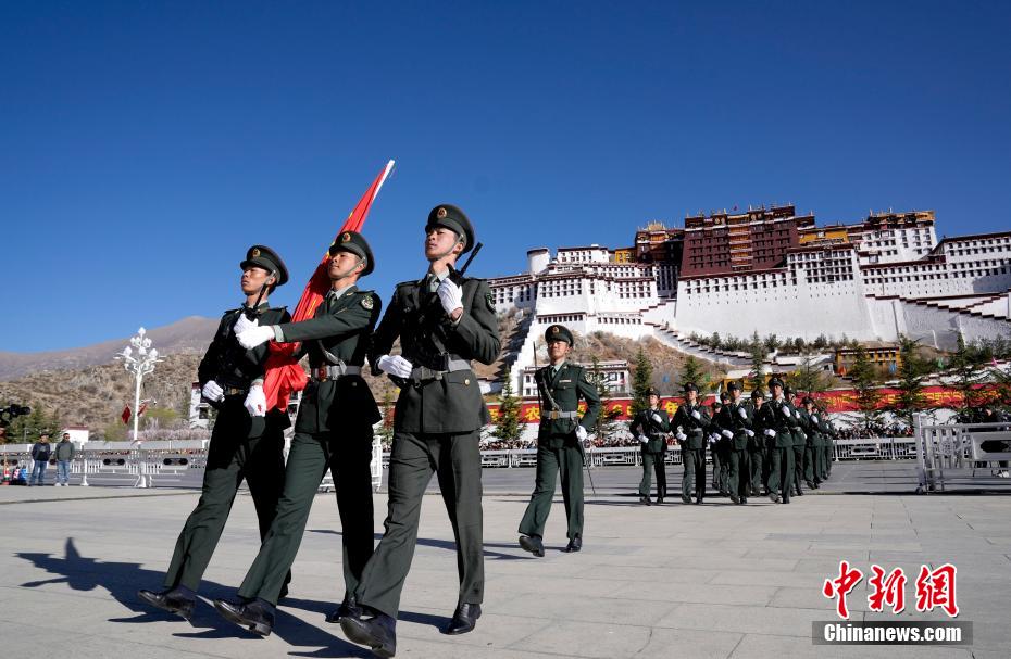 圖為國(guó)旗護(hù)衛(wèi)隊(duì)步入布達(dá)拉宮廣場(chǎng)。中新社記者 李林 攝
